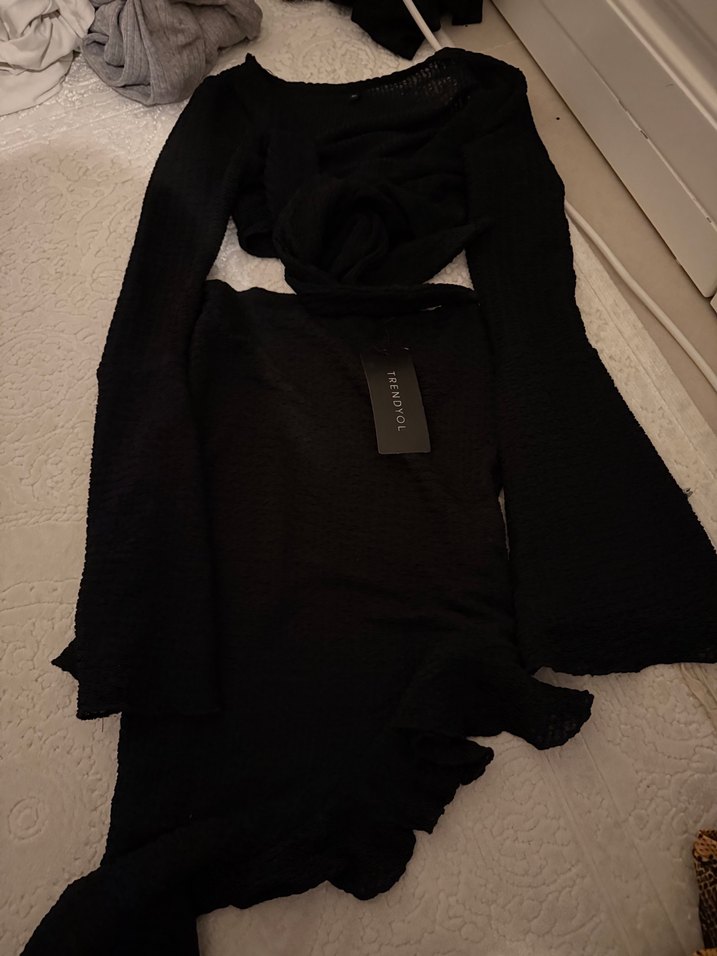 Siyah, mini uzun kollu bluz ve yırtmaçlı etek Drapeli detaylarıyla rahat ve gotik tarzda, günlük kullanım için uygundur.