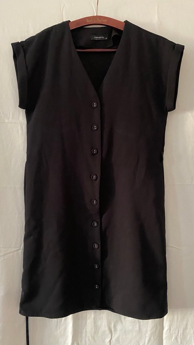 Siyah kısa kollu, V yaka ve düğmeli detaylara sahip kadın elbisesi. Rahat kesimi ve ipeksi dokusuyla minimalist goth tarzına uygun.
