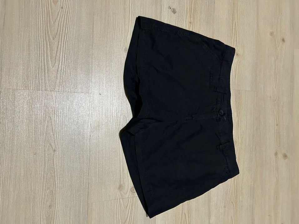 Siyah mini boy, düğmeli ve bol kesim kadın kumaş şort. Sentetik kumaştan üretilmiş, günlük rahat kullanıma uygun minimalist sokak stili.