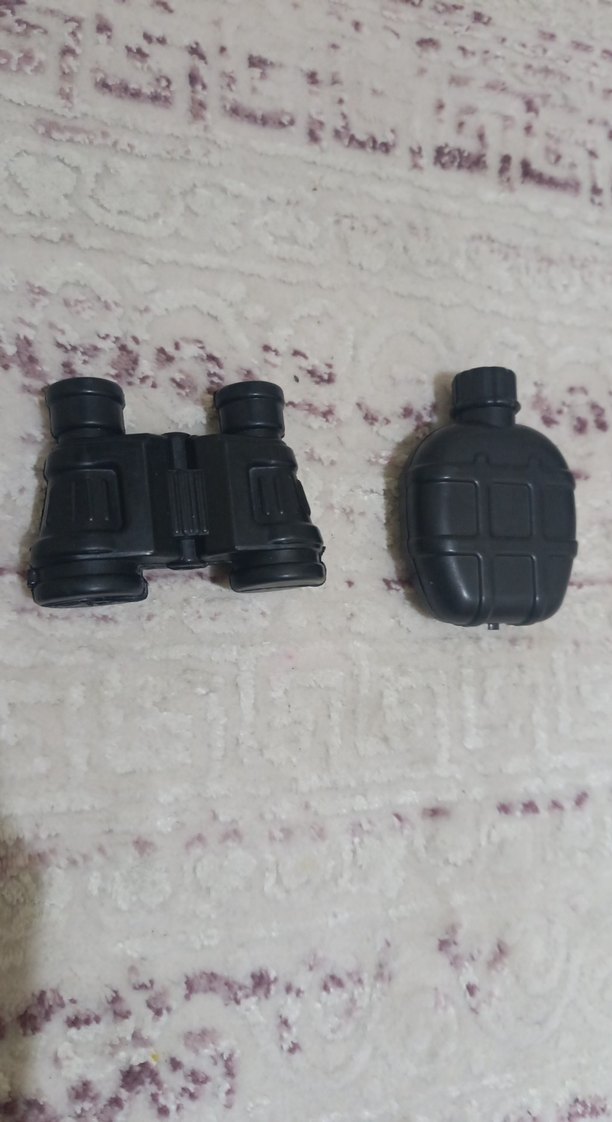 Dayanıklı malzemeden yapılmış siyah mini dürbün ve küçük matara seti. Seyahat veya doğa yürüyüşleri için uygundur.