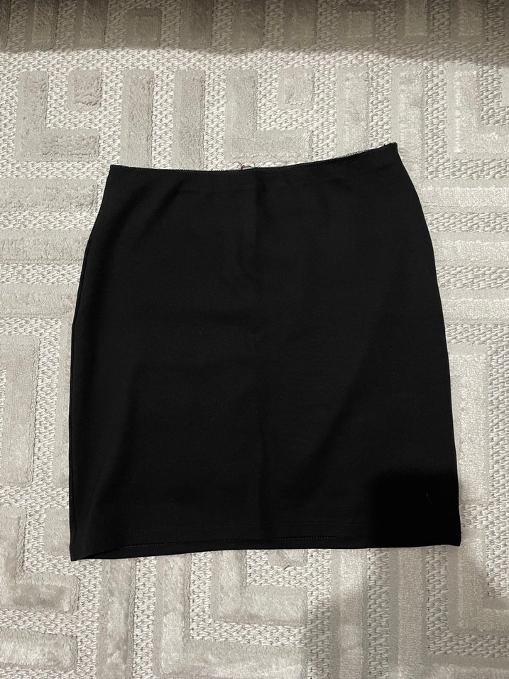 Siyah, düz ve vücuda oturan bu mini etek, sentetik kumaştan üretilmiş olup, minimalist ve gotik tarzda rahat dış mekan kullanımı sağlar.
