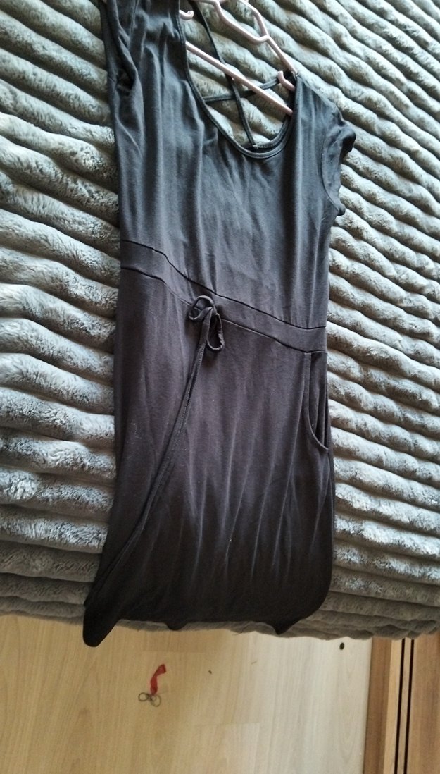 Gevşek kesim, yuvarlak yaka ve kısa kolları olan siyah mini elbise. Yumuşak penye kumaştan, ve belden bağlamalıdır. Günlük rahat kullanıma uygundur.