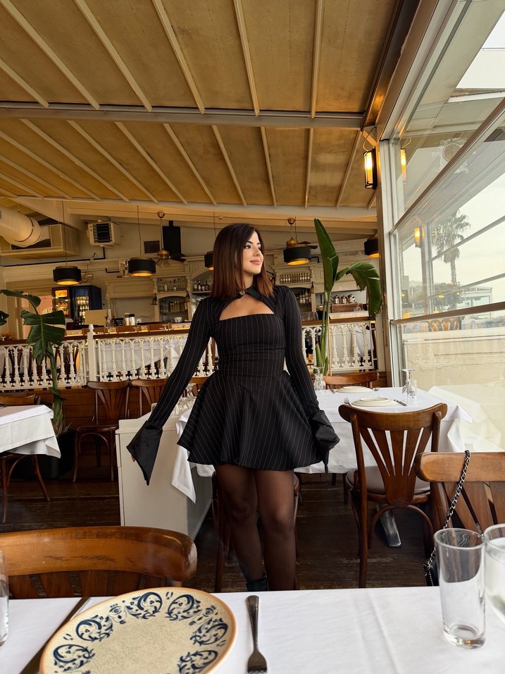 siyah, mini boy, uzun kollu, yüksek yakalı, pileli ve kareli desenli bu dar kesim elbise cesur romantik akşamlar için uygundur. Yaka detaylı Sadece doğum günümde giydim
