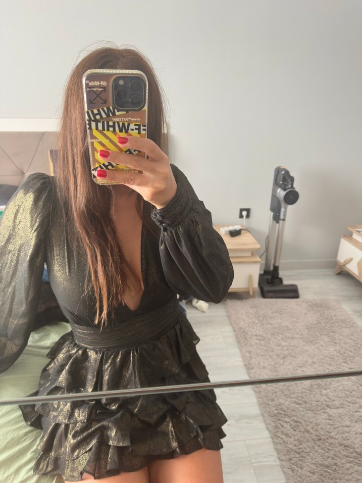 Siyah deri mini elbise, uzun kollu ve V yakalıdır. Fırfır detayları ve bağlama desenli avant-garde gotik tarzıyla romantik buluşmalar için uygundur. Elbise çok güzel ben göğüs dekoltesinden dolayı hiç giymedim muhteşem duruo fakat ben çocuğumla o dekolteyi göze alamadım fotodan daha güzel sıfırdır bu arada