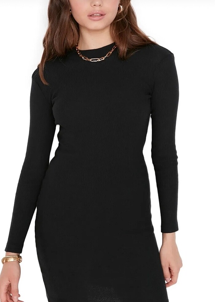 Vücuda Oturan Mini Dik Yaka Fitilli Esnek Örme Elbise