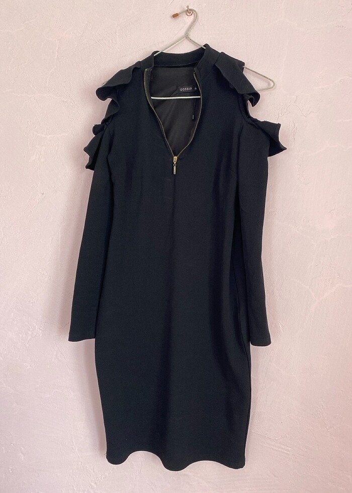 Giymediğim için satıyorum siyah omuz fırfır detaylı mini elbise L beden