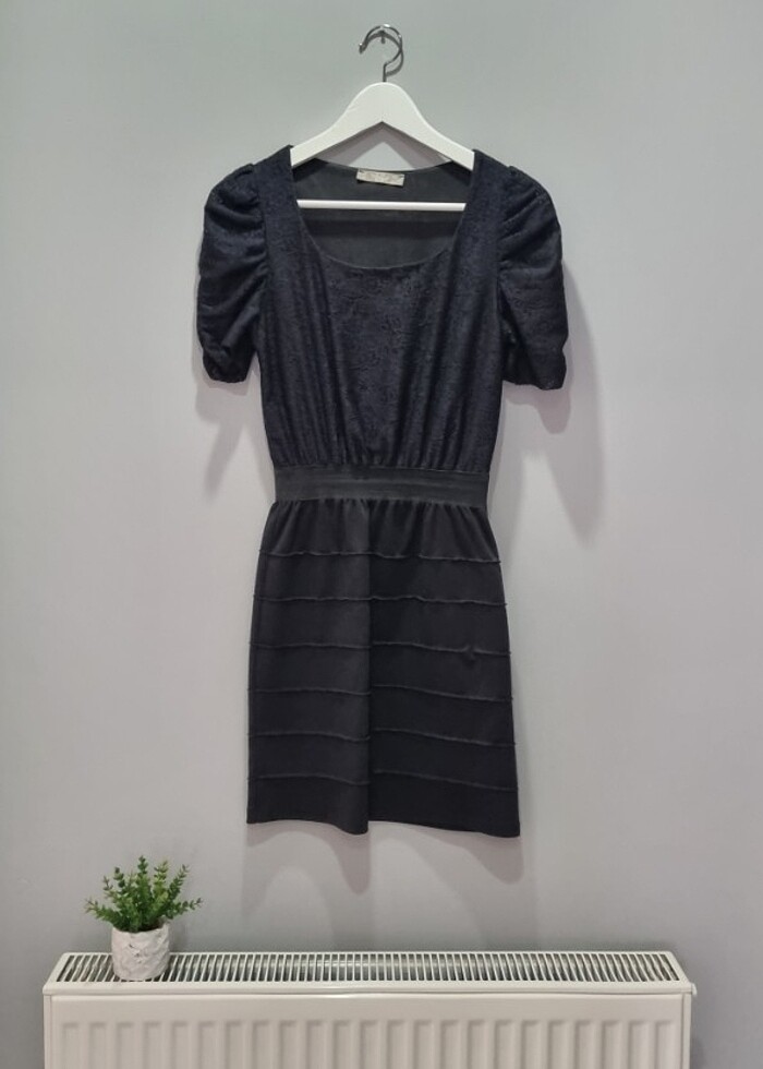 Üstü dantel desen beli lastıklı biyeli mini elbise