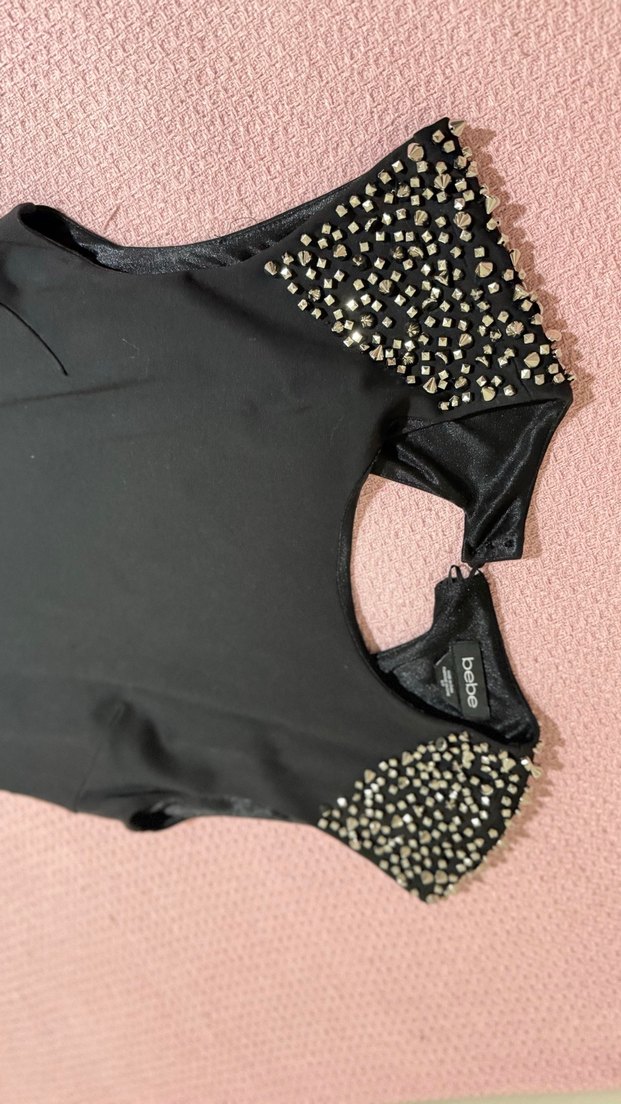 Siyah mini elbise yuvarlak yaka ve kolsuz tasarıma sahip olup, omuzlarda pul işlemeleriyle dikkat çekiyor. Parti için uygun, punk tarzında. S ve m bedene olur sırt dekolteli