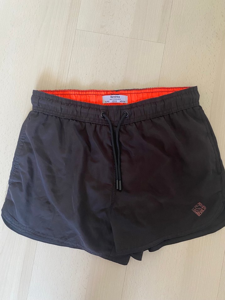 Düz siyah, turuncu iç astarlı, fit kesim mini erkek deniz şortu, plajda rahat ve şık bir görünüm sunar. ️