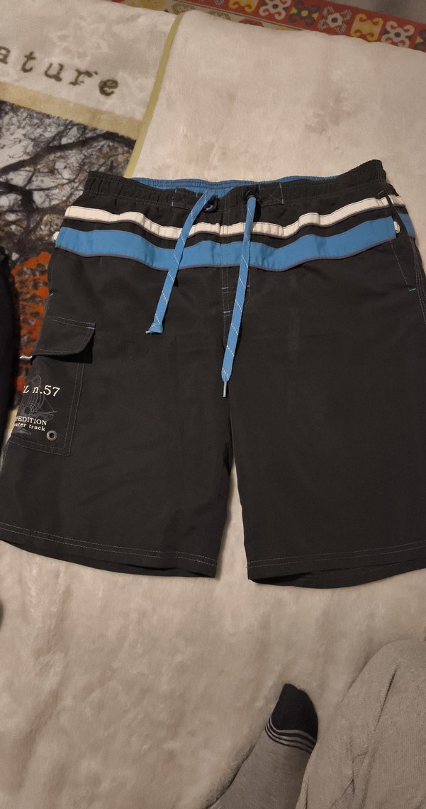 Siyah mini erkek deniz şortu, bol kesim ve kemer detaylı, mavi beyaz çizgili bel bandına sahip. Plaj için rahat athleisure tarzı.
