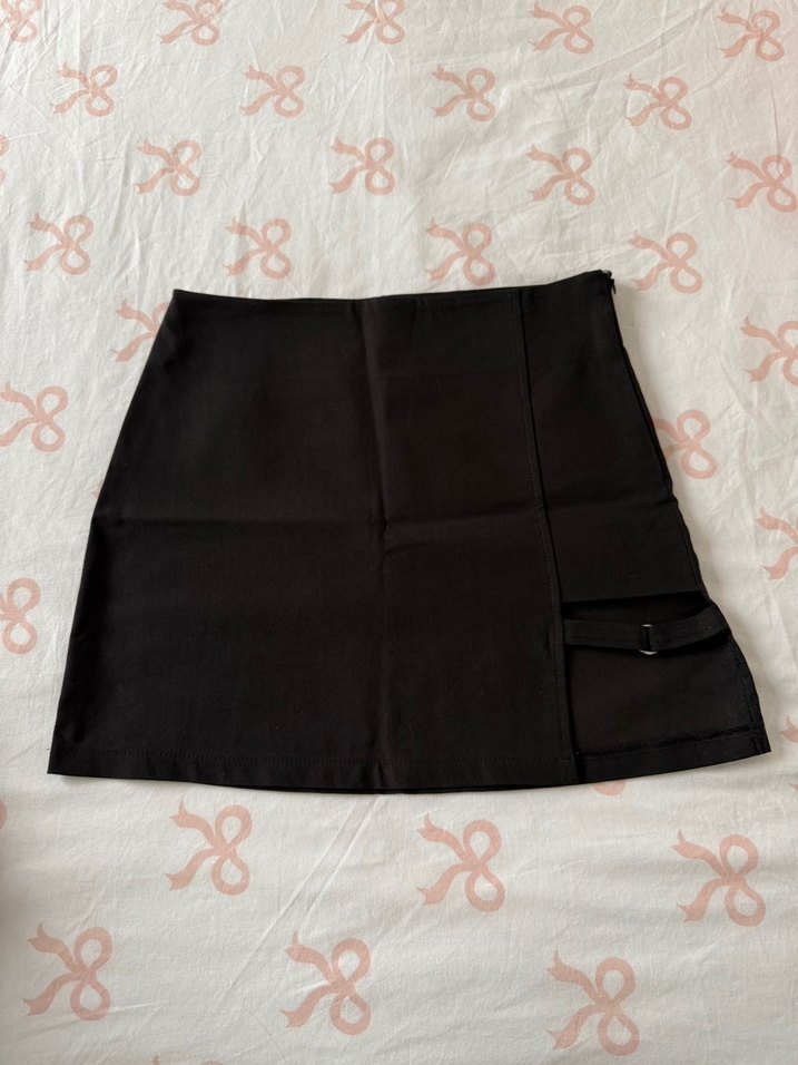 Siyah kemerli, sentetik kumaştan yapılmış, vücuda oturan mini etek kendinden jartiyerli etek bir kere giyildi tertemizdir Bel 68 cm Boy 38 cm ✨