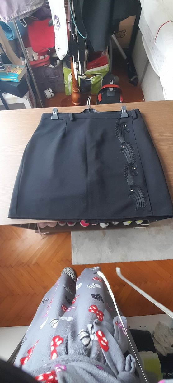 Siyah mini etek, düzenli kesim ve sentetik kumaştan yapılmıştır. Bir yanında ince süslemeler vardır, ofis için uygundur.