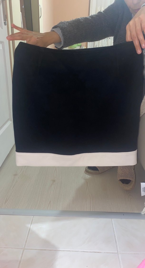 Siyah mini etek beyaz kenar detayı ve Velcro kapama özelliklerine sahip, yumuşak sentetik kumaştan üretilmiştir. Ofis ve sokak stiline uygundur.