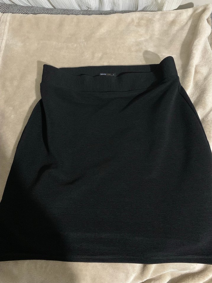 Siyah, düz kesim mini etek, rahat sentetik kumaştan, minimalist ve normcore ofis şıklığı için uygundur. ✨