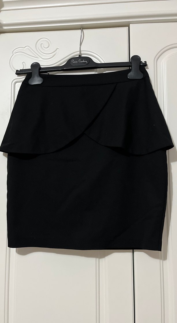 Sentetik kumaştan yapılmış, fırfırlı detaylı siyah dar kesim mini etek. Ofis için uygun, sade ve gotik tarzda.