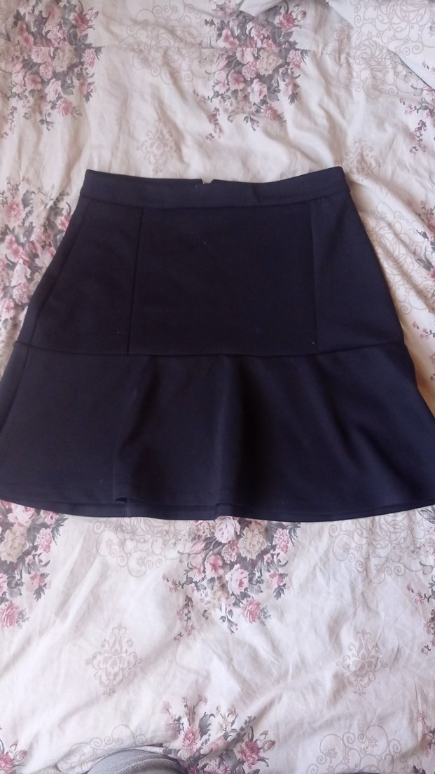 Siyah mini etek, dar kesim ve etek ucu fırfırlı detaylıdır. Pürüzsüz sentetik kumaştan yapılmıştır, trend ve gotik tarzlar için uygundur.