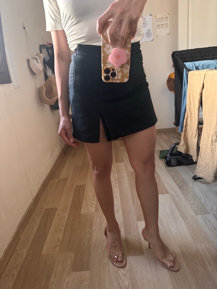 Düz siyah, fitted mini etek, önünde küçük yırtmaç detayı ile günlük rahat şıklık sunar. Sentetik kumaştan üretilmiştir. çok seksi bir etek iade süresini kaçırdım etiketli