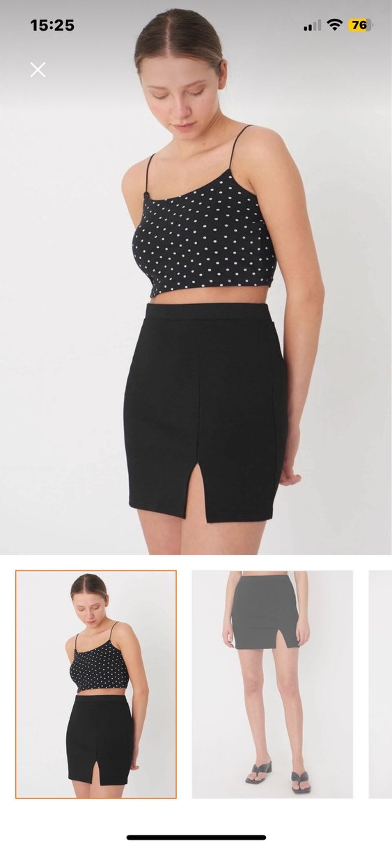 Siyah mini etek, ön yırtmaçlı ve sade tasarımlı. Pürüzsüz sentetik kumaştan, günlük sokak stiline uygun şık ve rahat bir parça.