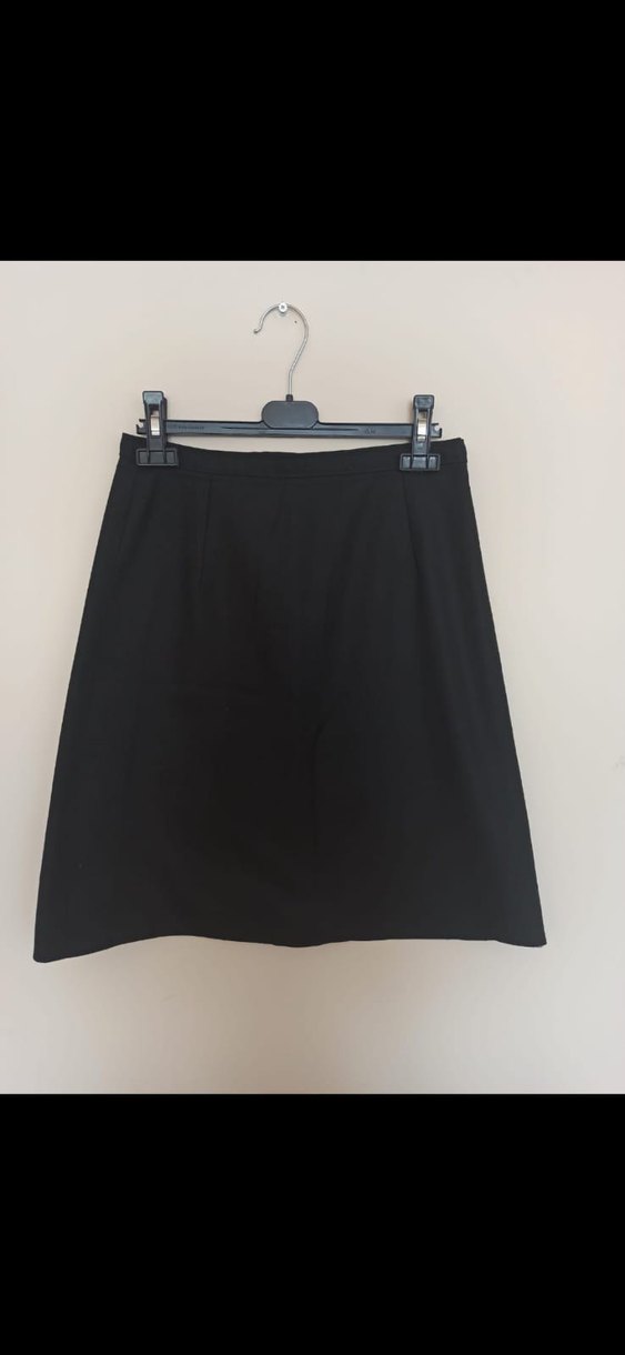 Siyah mini etek, rahat kesimi ve düz deseniyle ofis stiline uygun, minimal ve gotik tarzlara uyum sağlar. Sentetik kumaştan üretilmiştir.