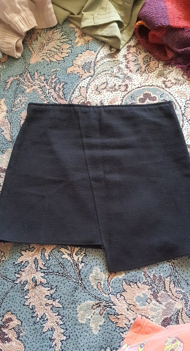 Siyah mini etek, düz kesim ve sentetik kumaştan. Sokak stili ve romantik akşamlar için şık ve sade bir parça. Asimetrik temiz etek
