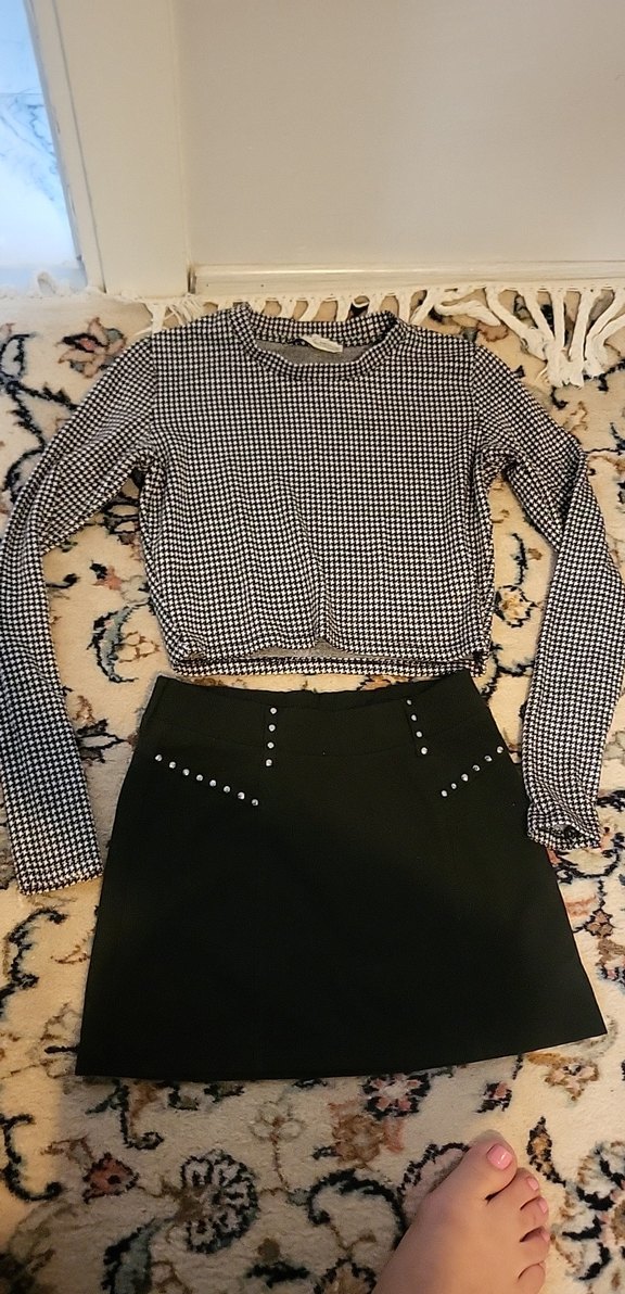 Düğmeli tasarıma sahip, düz siyah renkli, ince sentetik kumaştan yapılmış, günlük sokak stili için uygun dar mini etek. ve uzun kollu bluz