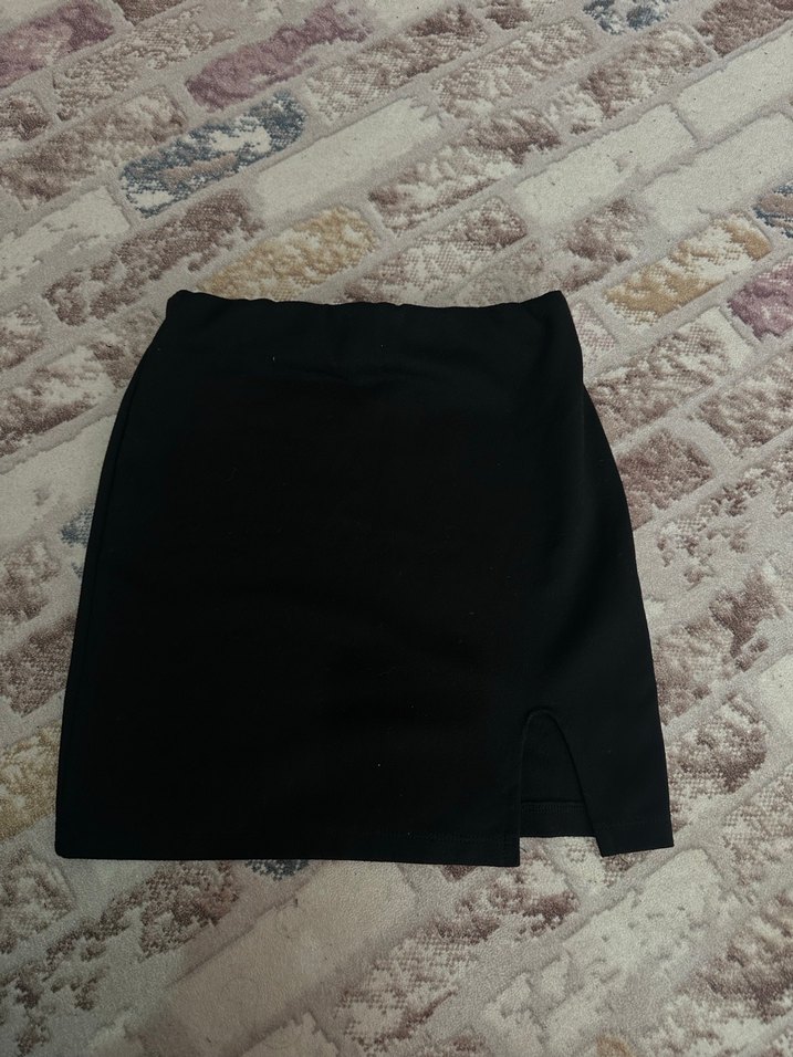 Düz siyah renkli, yırtmaçlı ve sentetik kumaştan yapılmış, vücuda oturan mini etek. Minimalist goth tarzı için uygundur.
