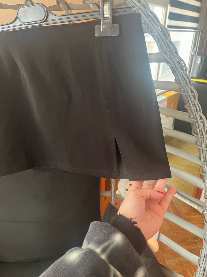 Siyah mini etek, dar kesim ve yırtmaç detayıyla. Pürüzsüz sentetik kumaştan, ofis ve sokak stiline uygun minimal tasarım. ✨ Fermuarı arızalıdır