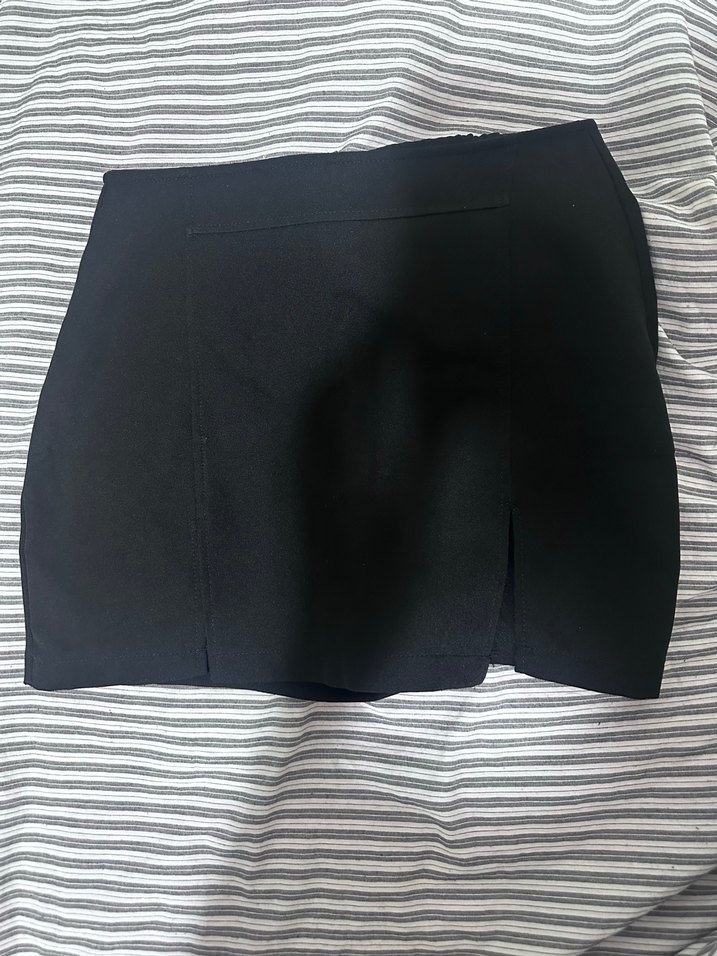 Hiç giyilmedi Düz siyah mini etek, dar kesim ve yırtmaç detayına sahip, sentetik kumaştan üretilmiş minimal sokak stili için uygundur.