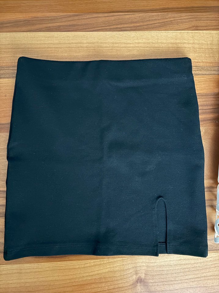 Siyah renkte, sentetik kumaştan yapılmış, dar kesim mini etek. Küçük yırtmaç detayı ve sade tasarımıyla günlük kullanım için uygundur.