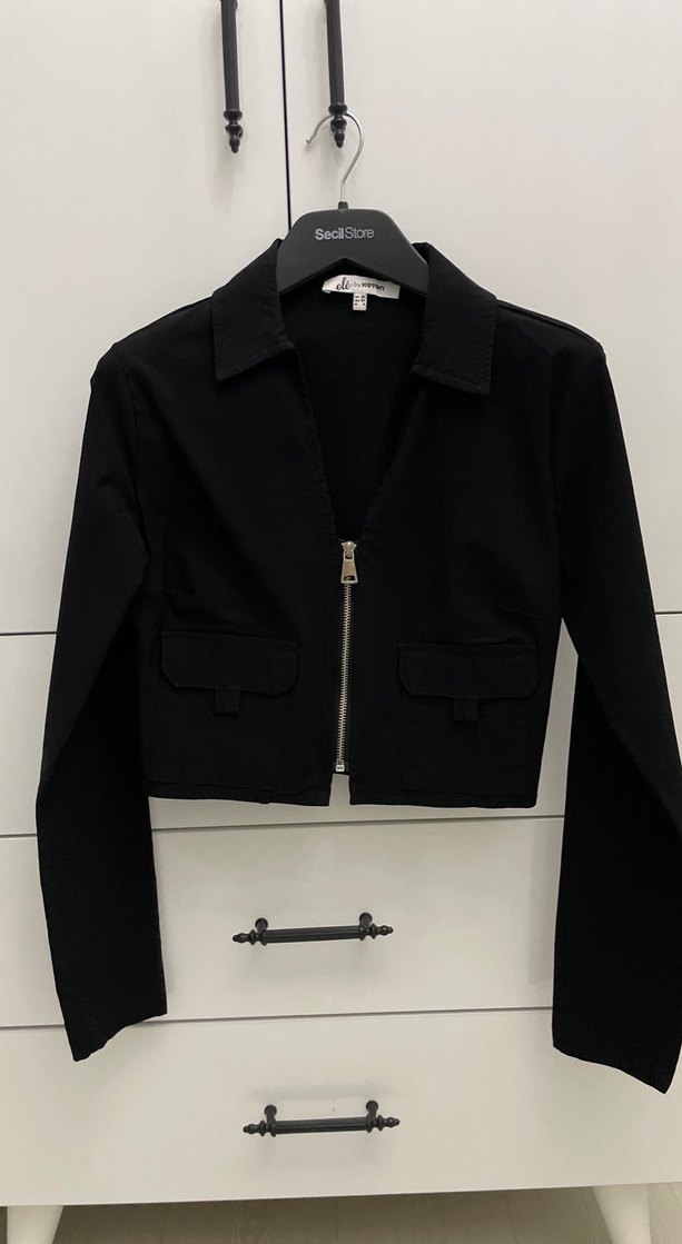 Fermuarlı, yakalı ve uzun kollu bu siyah mini ceket, ofis için uygun, şık ve desen içermeyen tasarıma sahiptir.