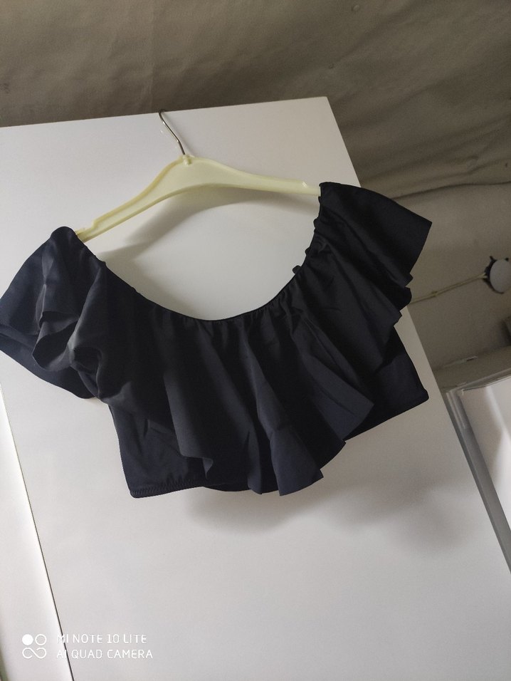 Fitted kesim, siyah mini bluz, tek renk, fırfırlı ve kayık yaka. Sentetik kumaştan, kolsuz, minimalist gotik tarzına uygun. Sadece etiketi yok denendi