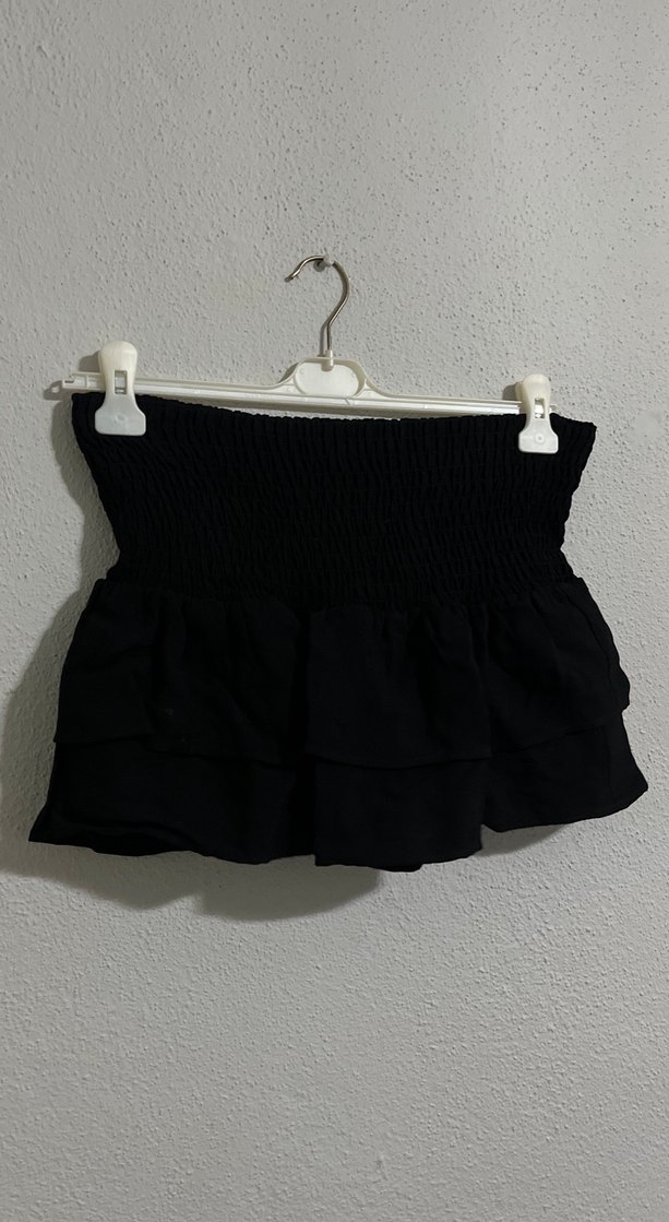 Siyah keten kumaştan, vücuda oturan ve fırfır detaylı mini etek, cesur goth tarzını günlük kullanım için sunar.