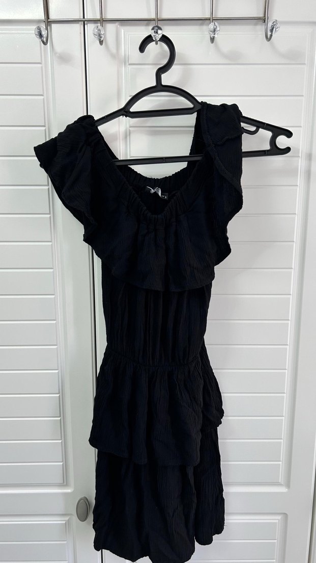 Nefes alabilen keten kumaştan yapılmış, fırfırlı detaylı ve straplez yaka siyah mini, vücuda oturan elbise. Günlük kullanıma uygun, gotik tarzda.