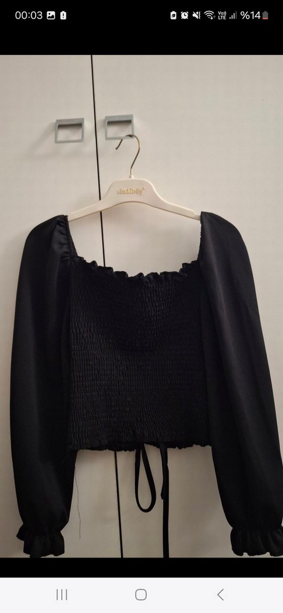 Siyah, dar kesim, uzun kollu ve fırfırlı detaylı tekne yaka mini bluz, sentetik kumaştan yapılmıştır. Günlük kullanıma uygundur.