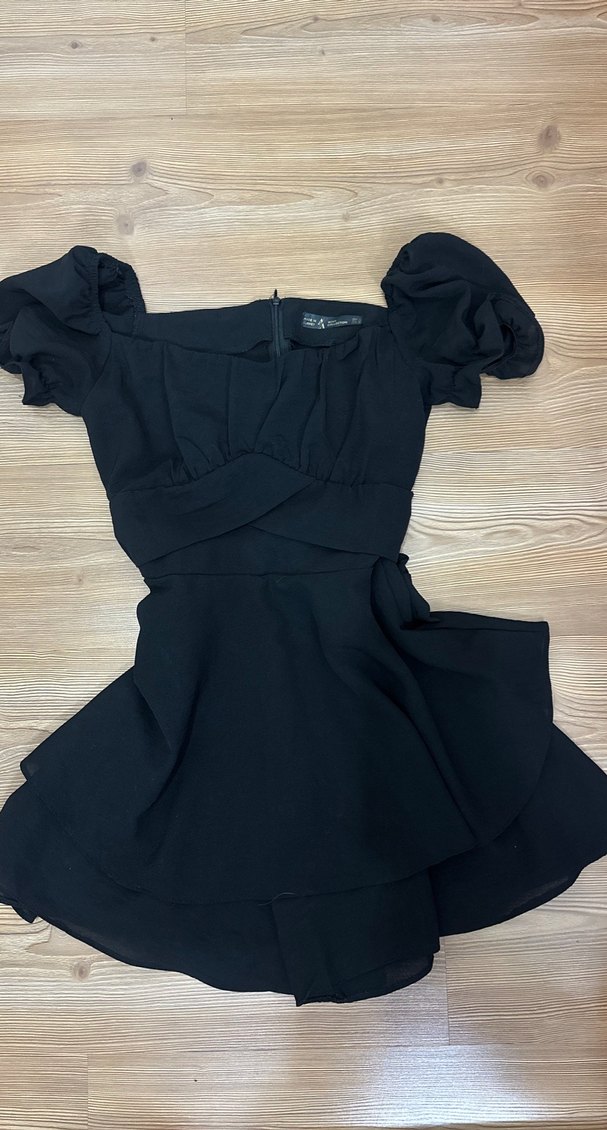 Dar kesim siyah mini elbise, balon kollu, V yakalı ve fırfır detaylıdır. Cesur Parisli gotik tarzını yansıtır, romantik akşamlar için uygundur.