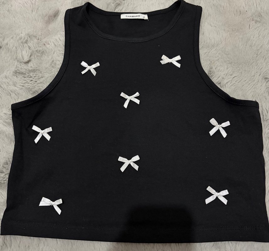 Siyah, dar kesim, kolsuz mini atlet, yuvarlak yaka ve küçük fiyonk işlemeleriyle sokak stiline uygun rahat bir parça.
