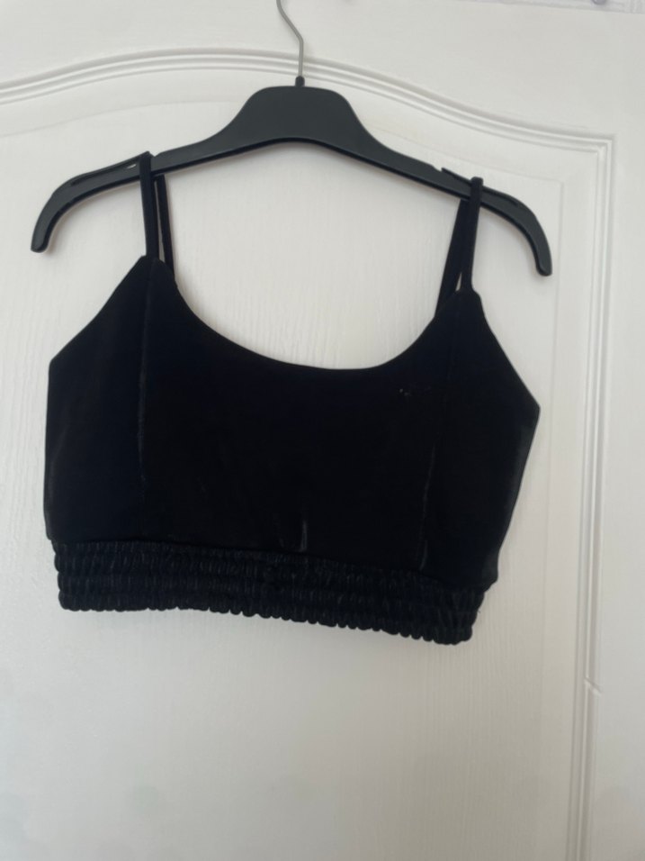 İnce askılı, bel kısmı lastikli siyah mini bralet, goth tarzını yansıtan kısa kesim atlet.