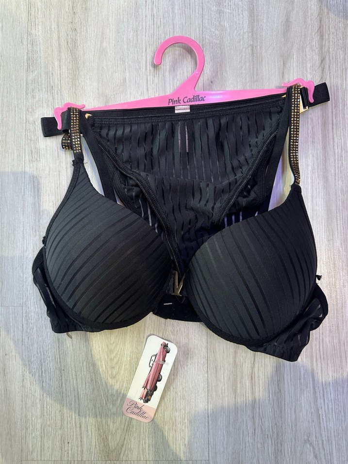 Siyah mini sütyen, kısa boylu ve desensiz. Glamorous goth tarzı ve süslemeli askılara sahip.