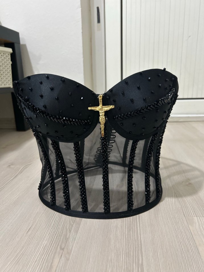 Siyah, straplez yaka ve boncuk işlemeli detaylara sahip, vücuda oturan gotik tarzda transparan mini bustiyer. Ortasında dikkat çekici altın renkli haç bulunur. ✨ arkası ayarlanabilir bağcıklı. Başka bedenler için lütfen mesaj atın