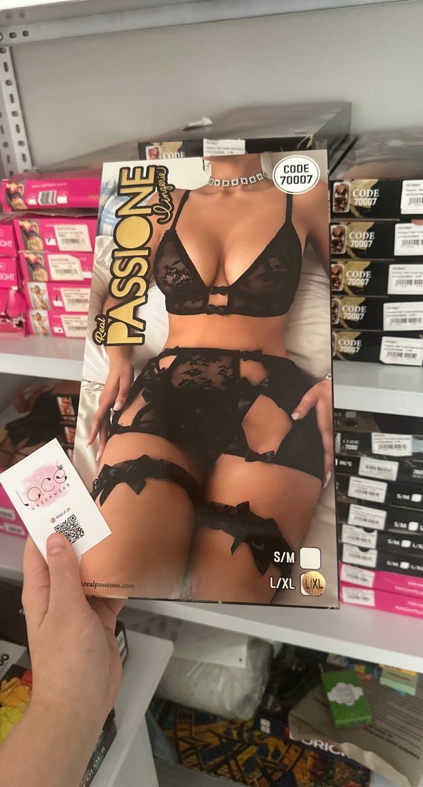 Siyah gotik desenli kadın iç giyim seti, sütyen, jartiyer ve çorap içerir. S/M ve L/XL beden seçenekleri mevcuttur.