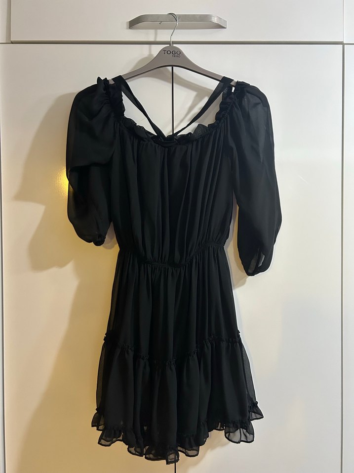 Siyah mini gotik elbise, fırfırlı ve kayık yaka detaylıdır. Kendinden fularlı ancak kullanılmama seçeneği de var. S-M uyumlu olur. Özel günlerde giyilebilir. Defosu yok