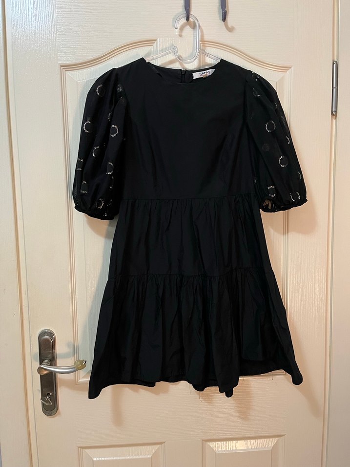 Siyah mini elbise, kısa balon kollu, işlemeli detaylara sahip. Yuvarlak yakalı ve fırfırlı katmanlı, gotik tarzda rahat kesim elbise. Öğrenciyim acil para ihtiyacım olduğu için satıyorum ürün temiz kullanıldı ve temiz gönderilecek