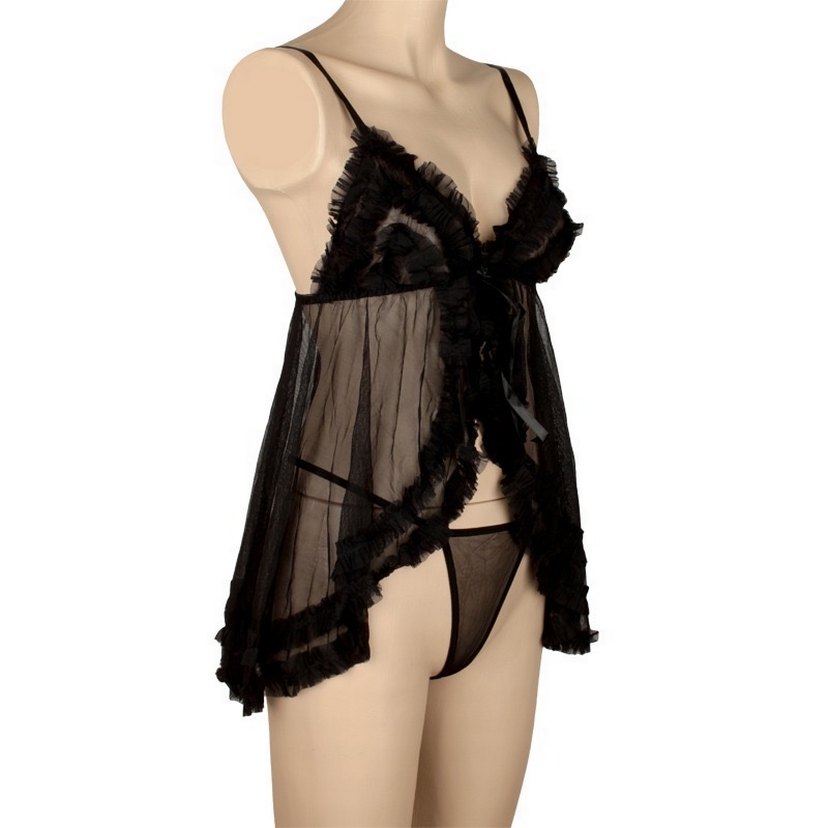 Siyah, ince askılı, kısa ve vücuda oturan mini gecelik, transparan kumaş ve fırfır detaylarıyla gotik tarzı yansıtıyor. S-M-L beden uyumludur.Hijyen kuralları gereği iade yoktur.