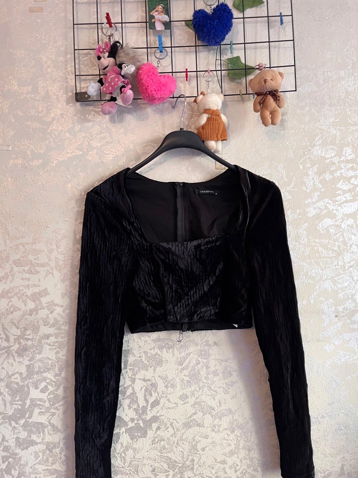 Siyah mini boy, uzun kollu, tek renk ve kürk detaylı gotik stil bluz. Yumuşak sentetik kumaştan yapılmıştır.
