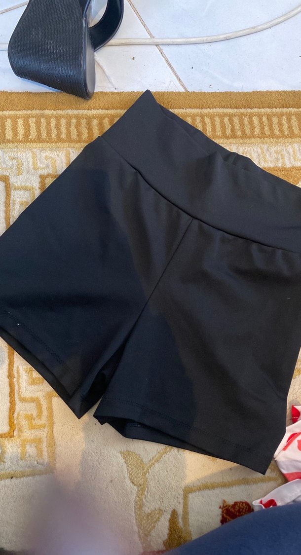 Düz siyah, vücuda oturan mini hamile şortu. Spor ve rahat tarz için yumuşak sentetik kumaştan üretilmiştir.