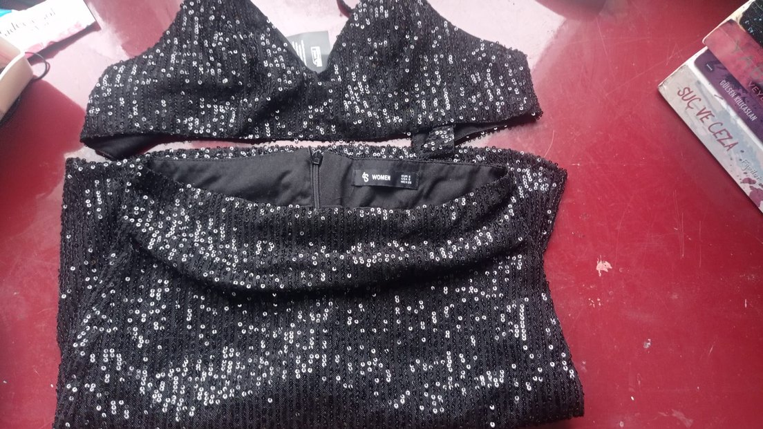Siyah mini sütyen, ve etek işlemeli siyah payetlerle gotik ve gösterişli bir tarz sunar. ✨ simli ve parlak