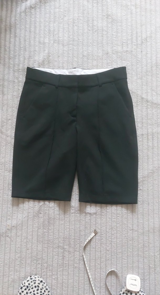 Düz siyah, mini uzunlukta, regular fit kadın Bermuda şort. Pürüzsüz sentetik kumaştan, ofis stiline uygun sade ve şık görünümlü. Kumaş kalitelidir ölçüleri BEL çevresi: 80 cm.dir Boy 50 cm.dir