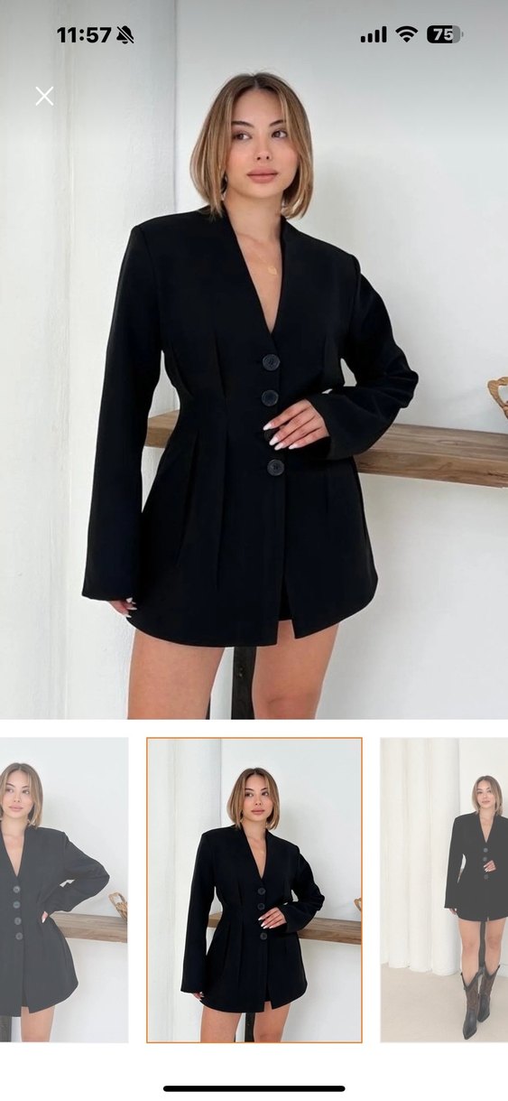 Siyah mini blazer, kesik yaka, uzun kollu ve düğmeli. Regula fit, sentetik kumaştan, ofis ve cesur sokak stili için uygun. Hiç giyilmedi iade süreç geçtiği için iade edemedim.