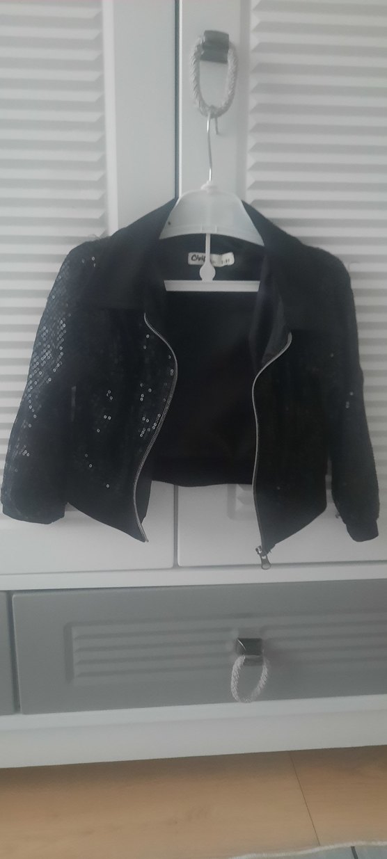 Siyah mini uzun kollu, düğmeli ceket, suni kumaştan olup, desen içermeyen sade bir tasarıma sahiptir. Sokak stiline uygundur. çok ufak ipcikler var onun disinda bir sorun yok az kullanildi