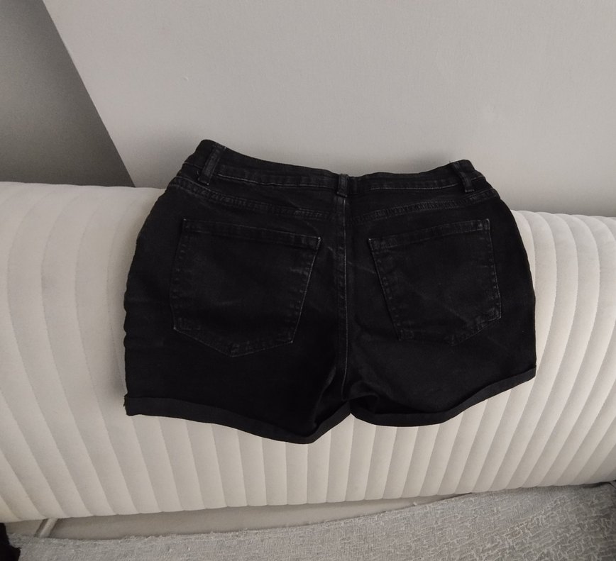 Bu siyah mini denim şortlar, kısa boy ve rahat kesimiyle günlük dış mekan sokak stili için uygundur.
